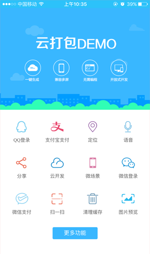 云打包DEMO是一款测试云打包功能和插件的工具为用户提供了方便快捷的体验方式,云打包开发了大量的功能和插件供用户灵活使用,配合云打包的插件使用将能够使得APP更加优秀。